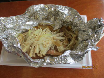 玉ねぎやえのきを均等に切ったり、鮭に下味をつけたりと仲間と協力して調理をしていました。この経験を家庭で活かしてほしいです。