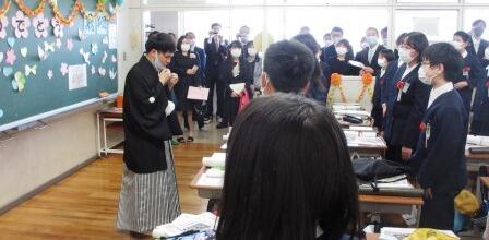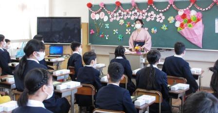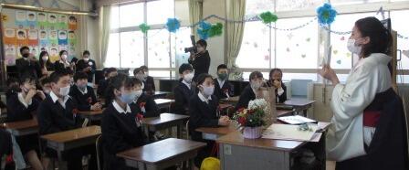 離任される先生の学級では、子どもたちによるお花やカード贈呈の場面も。
