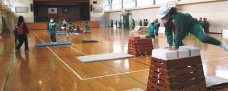 手前は開脚跳び、奥の方では台上前転にチャレンジ。