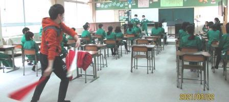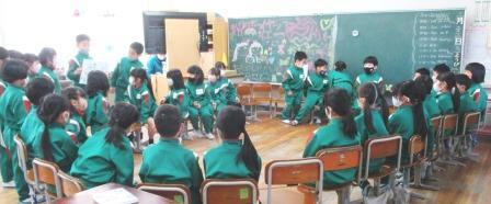 1年生は、お楽しみ会で「爆弾ゲーム」を始めるところでした。