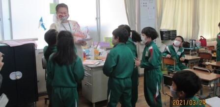 離任される先生の学級では、子どもたちによるお花やカード贈呈の場面も。