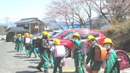 はじける笑顔で「さようなら」と手を振り下校する3年生。