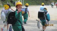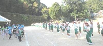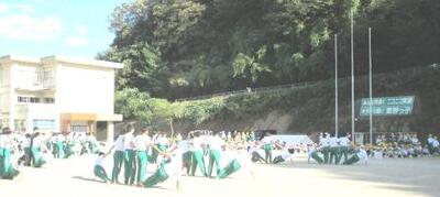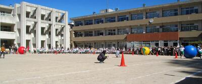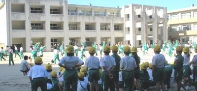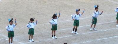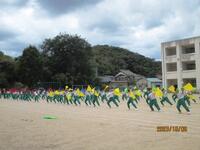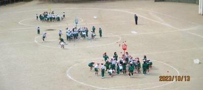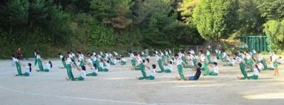 朝活動の時間から1限目、6年生が初の校庭での体育大会表現練習。
