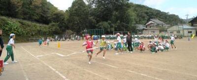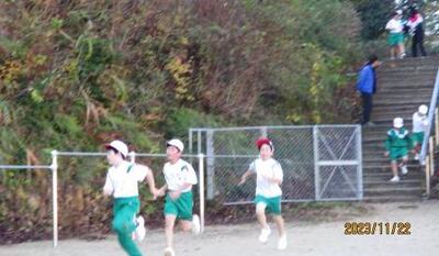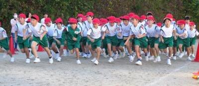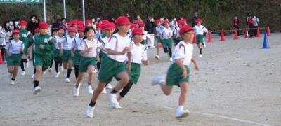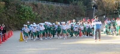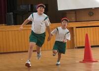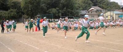 ゴール目指し、全力疾走の1年生。徒競走の練習です。