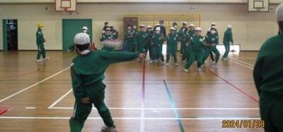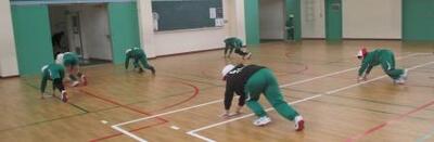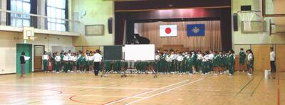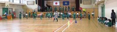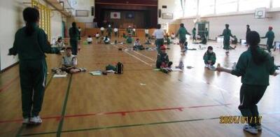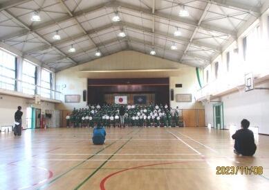 子どもたちも先生も裸足です。体育館練習で学んできたことを