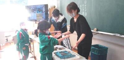 2年生 早く食べ終わった子が後始末。水でご飯粒もキレイに!