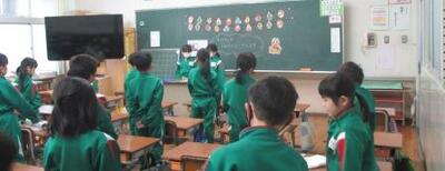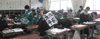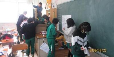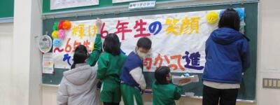 6年生教室の前面黒板・窓枠の飾り付け。手分けして段取りよく。