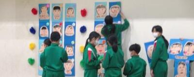 教室の背面には、6年生を送る会でも活用した「6年生の顔」を掲示。