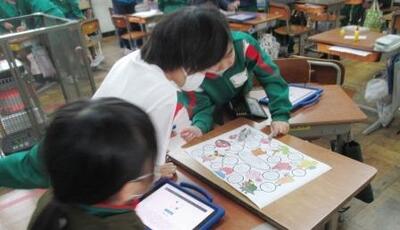 4年生は、年賀状ならぬ「年賀カード」を作成していました。