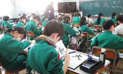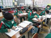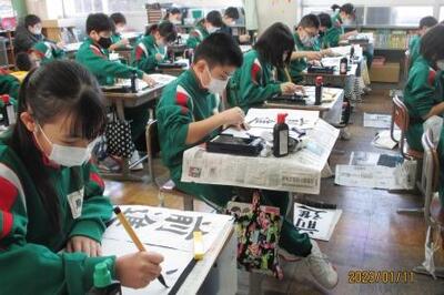 2年生は、書初の課題「きれいな はつ日出を 見ました」の練習。