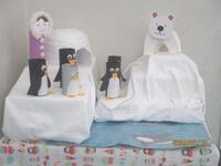 先端の猫の絵や色画用紙でつくったサメの歯を友だち同士で見せ合います。