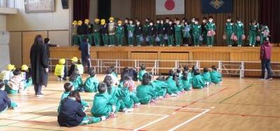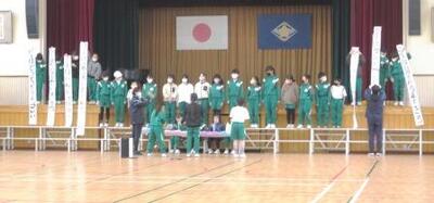 「健康・感染症防止」の話を聞いた後、大樹の歌の斉唱をする1年生。