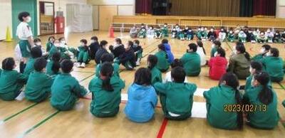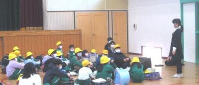 敦賀警察署の方による「ひまわり教室」で話を聞く6年生。