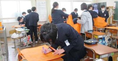 6年生は、オレンジ色の作品バッグに絵や名前をかき、