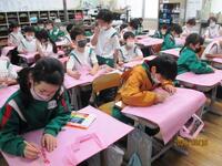 2年生はピンクの作品バックに好きな絵や文字を書き入れていました。