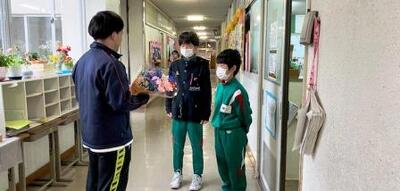 代表児童が、お礼・激励の言葉を伝え、花束の贈呈をしました。