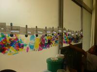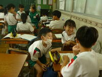 1年生は、七夕かざりをつくっていました。切り方を工夫して、素敵なかざりが次々にできあがっていました。2年生は、ステンドうちわができあがり、展示をしていました。窓際に並べたうちわが光を反射して、ステンドガラスのようです。3年生は、毛筆で「日」という字を練習していました。筆をまっすぐに立て、背筋をピンと伸ばしてきれいな姿勢で書いていました。4年生は、つなぎ言葉の勉強をしていました。グループでの話し合いがとても楽しそうです。5年生は、英語でペアワークをしていました。好きな食べ物やスポーツのことなど、英語で質問したり答えたりしていました。6年生は、くるくるクランクの最後の仕上げをしていました。個性あふれる作品が仕上がっています。
