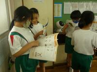 1年生は、音読発表会をしていました。「おおきなかぶ」を班のメンバーで分担して、リズムに乗って豊かに表現していました。2年生は、クラフト紙の袋をくしゃくしゃにして、立体にしていました。「お魚」や「おばけ」などイメージを膨らませて作っていました。3年生は「昆虫図鑑」を作っていました。「アキアカネ」や「かぶとむし」など、お気に入りの昆虫を選んで、身体のつくりや好きな食べ物、一生の過ごし方などを調べて、世界で1つだけの図鑑にするようです。4年生は、学級新聞を作っていました。グループでテーマを決めて、相談しながら記事を書いていました。5年生は、社会の授業で「米づくり」について調べていました。どんな人がどんなふうに関わりながらお米が育っていくのか、田んぼの学校の経験も生きているようです。6年生は、人権教育の出前授業を開催していました。人間らしく生きる権利について、いろいろな事象から考え、授業後には「楽しかった!」「勉強になった!」といった感想が上がり、充実した時間になったようです。