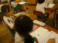 1年生は、タブレットで「3つのかずのけいさん」の問題を解いていました。タブレットをスムーズに使いこなせるようになっています。2年生は、ダンシング玉入れの練習をしていました。リズムに乗ってノリノリでダンスしながら玉入れをします。3年生は「小」という字の練習をしていました。とめ、はね、はらいに気をつけて、丁寧に書いています。4年生は、個性あふれるコリントゲームができあがり、友だちと説明し合ったりお試しをしたりしていました。5年生は、読書感想画のアイデアをタブレットに書き込んでいました。友だちや先生と相談しながら熱心に取り組んでいます。6年生は、Let's see the world.のインタビュー活動をしていました。ペア活動が楽しそうです。朝夕は涼しくなって、子どもたちの活動も活発になってきました。よくがんばった1週間です。