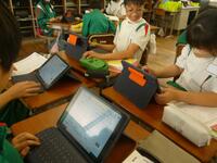 1年生は、6年生による朝の読み聞かせを楽しみにしています。2年生は、図工の授業で「ふしぎなたまご」をテーマに、想像力を膨らませて絵を描いていました。3年生は、学年体育でリレーの練習をしていました。バトンパスやコーナリングも上達してきました。4年生は、パラリンピックについて調べ学習をしていました。パラリンピックとはどういう大会なのか、参加している選手の人はどんな気持ちで出ているのか等、タブレットや動画を見て調べていました。5年生は、算数の授業で小数のかけ算をしていました。自分の考えを持って話し合い、タブレットで共有して学びを深めています。6年生は、家庭科の授業で調理実習をしていました。ほうれん草とベーコンのソテーを作る様子を動画で撮影し、振り返りに使うそうです。朝から雨の降り続くあいにくの天気となりましたが、雨にも負けず、元気にがんばった子どもたちです。