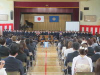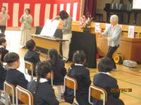 入学式は、6年生も参加して行われました。6年生が披露してくれた校歌に、じっと聞き入っていた1年生。担任の先生との学活を終えると、地域の図書ボランティアさんらによる手作りの人形劇や、大型絵本を使った朗読に、大喜びしていました。