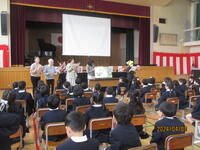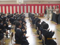 「1年生を迎える会」を開催しました。「さんぽ」の歌と手拍子に乗って、元気に入場してきた1年生。運営委員長の挨拶をしっかりと聞いて、きちんと返事もできました。運営委員会が考えた「粟小クイズ」では、全校児童数や校長先生の名前、粟小キャラクターや黄色帽子の意味など、1年生が粟野小学校にますますなじめるように、工夫を凝らしたクイズがスライドと一緒にスクリーンに映し出され、全校児童が大盛り上がりしました。1年生が、覚えたての「校歌」を大きな声で歌い上げると、在校生からは「おお~」という歓声と大きな拍手が起きました。忙しい中、1年生を迎える会の準備をしてくれた児童会運営委員の皆さん、おかげさまで、1年生はもちろん、全校のみんなが一緒に楽しめる心のこもった温かい会になりました。全校児童527人と先生方とで、力を合わせて楽しい粟野小学校をつくっていきましょう。