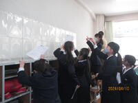 学活では、担任の先生のお話を聞いたり、新しい教科書やノートを確かめたり、係の仕事を相談したり、掲示を作ったりと、各学級で熱心に活動する様子がありました。学年が上がるにつれて落ち着きが増し、6年生の集中力はさすがでした。