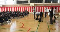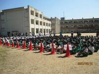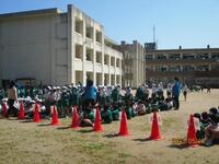続々、避難場所に集合し人数確認 避難完了しお話を聞く全校児童