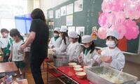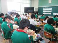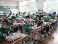 4時間目から給食のお勉強。他の学年より早く給食準備にかかりました。