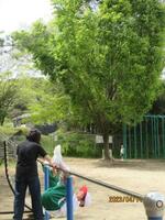 「虫がいる~」と叫んでいる子も! 虫だって日陰を求めます。