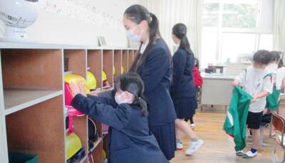 朝、6年生が1年生の教室でランドセルの片付けや身支度のお手伝い。