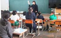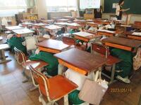 地震直後、机の下にもぐる3年生 体育中の4年生は体育館中央に
