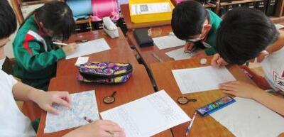 2年生は生活科で「学校たんけん」にむけての教室案内板づくり。
