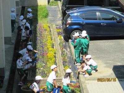 2年生は、花壇の花を観察したり、写真を撮ったりしていました。