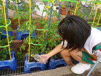 1年生は「あさがお」を、2年生は自分で選んだ「やさい」を育てています。毎朝グランドに出て、自分のプランターに水やりをしたり、タブレットで写真をとったりして、生長ぶりを確かめながらお世話をしています。朝顔も野菜も、たっぷりの水と太陽の光を浴びて、すくすくと育っています。