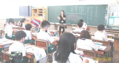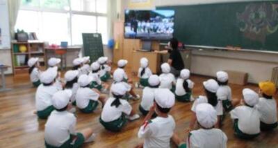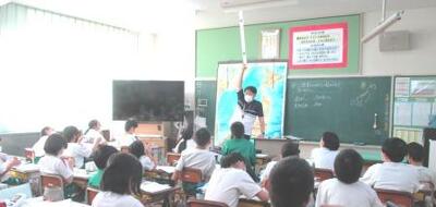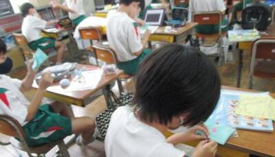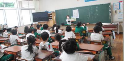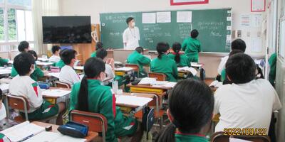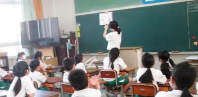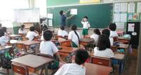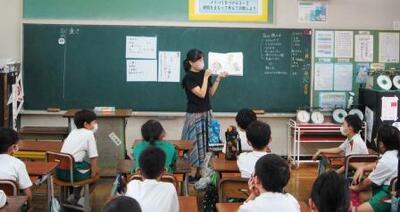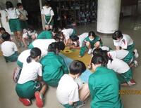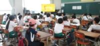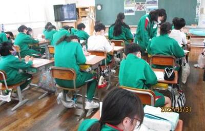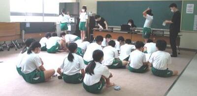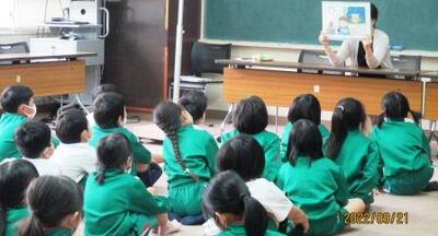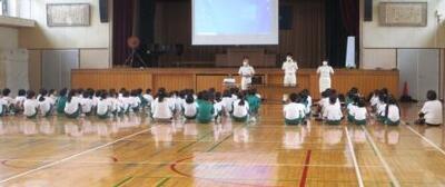 身体測定の後、保健の先生の「紙芝居」を真剣に見入る2年生。