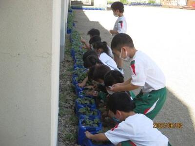 雨が上り、薄日が差す中、2年生が野菜の観察をしていました。