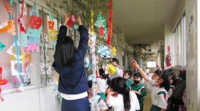 1年生は、図工で、七夕飾りをつくっていました。まずは、輪飾りづくり。