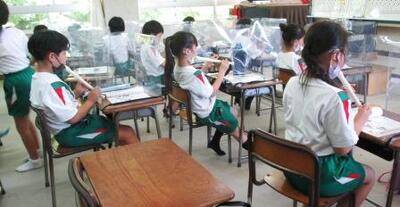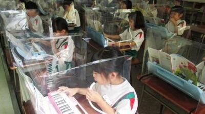 どの子も一生懸命、音を鳴らしていました。飛沫防止ガードもあり、安心!