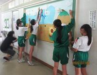となりの教室の背面掲示板には、てるてる坊主がズラリ!
