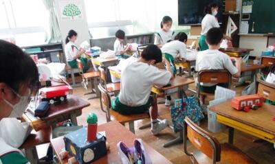 2年生は、給食の牛乳パックを使って「ピョンピョンガエル」づくり。