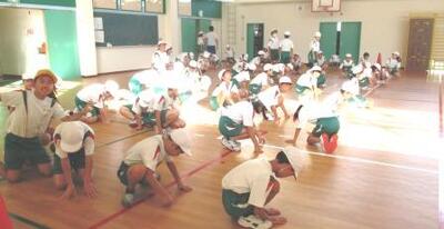 みんなで「足はペッタン 背筋はピン お腹と背中にグー一つ」
