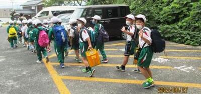 ほぼ予定通りの時刻、6年生を乗せたバスが粟野公民館に到着。