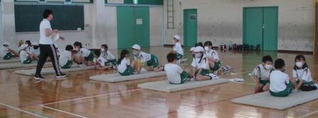 体育館では2クラスが、上体起こし(上の画像)と立ち幅跳びを。