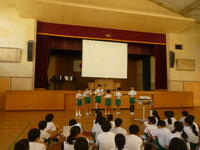 体育大会に向けての『結団式』を行いました。体育大会テーマ『笑顔かがやけ 粟小物語』が発表されると、会場からは大きな拍手が起こりました。団長・副団長一人一人が、自分の言葉で体育大会への思いを堂々と発表し、これもまた大きな拍手が沸き起こりました。プログラムやしおりに掲載されるイラスト作品も発表され、早くも体育大会に向けて熱量が高まっています。10月23日の本番に向けて、本格的に練習が始まります。
