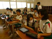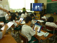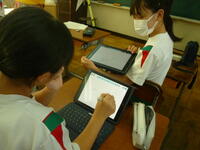 1年生は、来年度入学してくる1年生にプレゼントする朝顔の種を入れる封筒を作っていました。なんだかとってもうれしそうです。2年生は、2パターンの式を考えていました。真剣に考え込む姿が、さすが2年生です。3年生は、回旋リレーの練習をしていました。まだまだうまくいきませんが、みんなで意見を出し合って工夫しています。4年生は、書写で『左右』と書いていました。正しい筆順で書くときれいに整うことに気がついたようです。5年生は、『夢の世界を』を歌う様子を自分で録画していました。自分で自分を撮影するのはちょっと照れますが、自分が歌う姿をその場で確認できるのもタブレットの効果ですね。6年生は、社会のまとめでクイズ大会をしていました。すぐに結果が集計されて、得点率が分かります。ひんやりとした朝の空気に秋の訪れが感じられる、連休明けスタートの1日となりました。