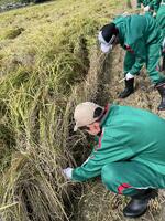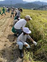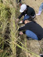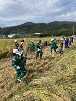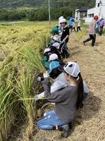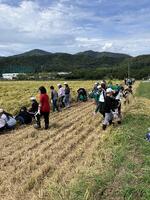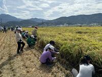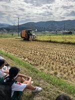 5月に植えたお米を刈る「田んぼの学校」がありました。バスに分乗して運動公園近くの田んぼに到着すると、豊かに実った黄金色の稲が、頭を垂れて広がっていました。地域の方に教えていただきながら、慣れない手つきで稲を刈っていった子どもたち。最後はコンバインで一斉に刈り上げていく様子も見せていただきました。この後、刈った稲は乾燥させて脱穀してお米となります。田植えと稲刈りを体験させていただいたお米、どんな味がするか楽しみです。