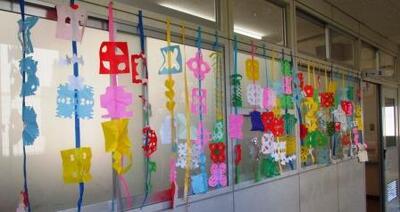 1年生教室の廊下に、すてきな飾りがずらりと並びました。