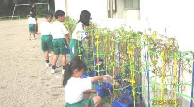 小さな種から成長(熟)したアサガオを大切に大切に育む子どもたちです。