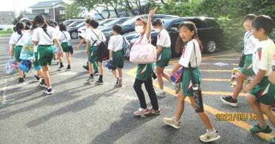 朝、水泳学習のため、元気はつらつ運動公園に出発する4年生。